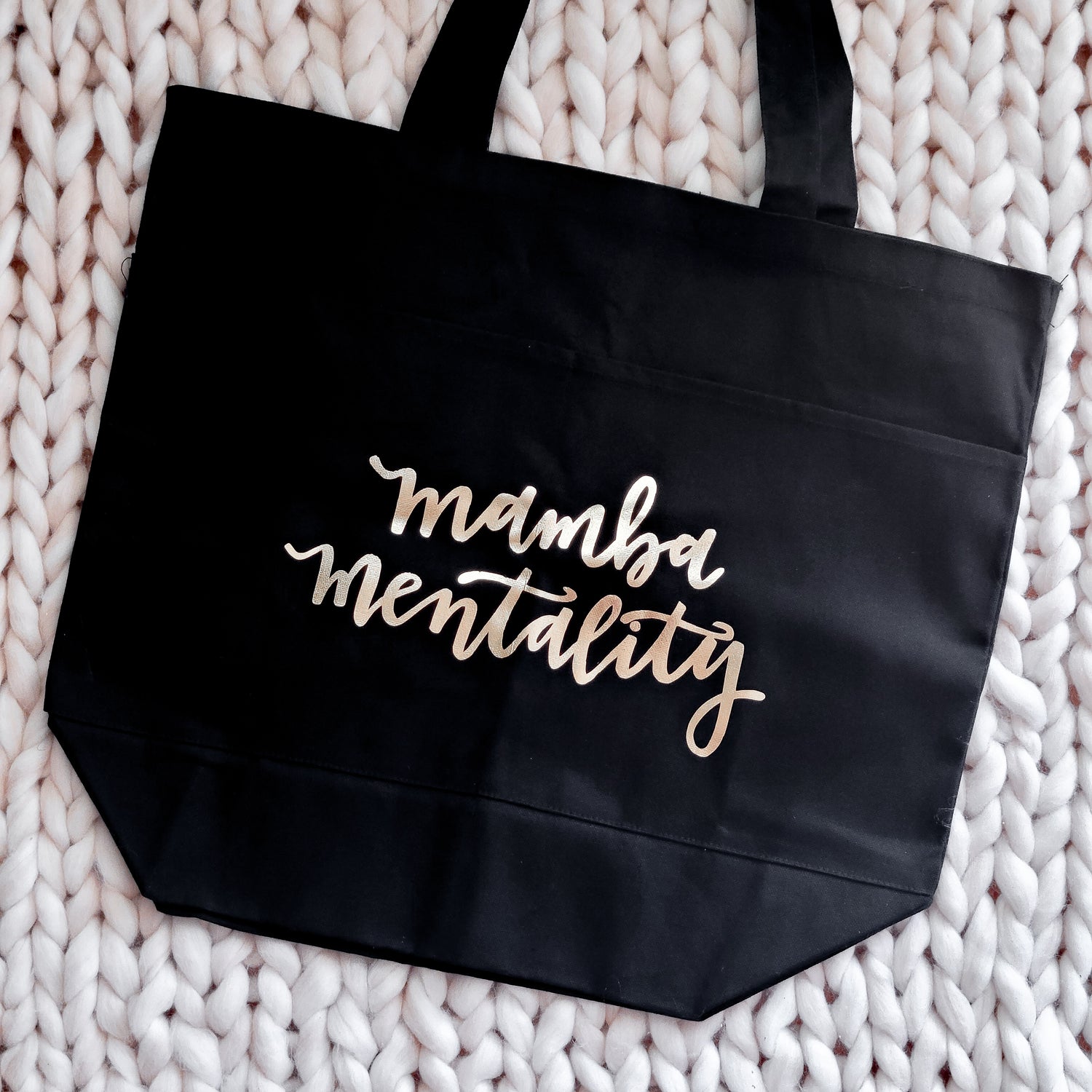 Tote around your belongings with this black canvas tote bag with two front pockets and hand lettered and gold foiled design "Mamba Mentality." Details: 16 5/8" L x 19" W x 6 1/8" D. Handle Drop Length: 8 1/2"